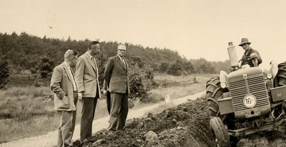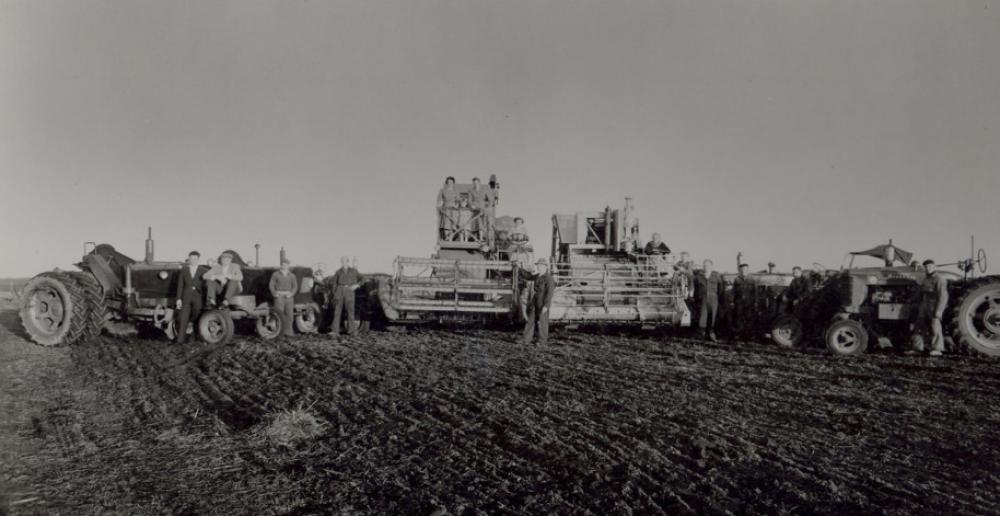 De eerste combine schaften ze begin jaren vijftig aan, een Massey Harris. "Toen we hem hadden aangeschaft vroegen ze wat we ermee moesten. Een loonbedrijf uit de omgeving had juist een dorscombi gekocht maar daarmee kostte het maaien en dorsen veel meer tijd." De combine had, zo bleek, de toekomst. Het bedrijf groeide gestaag. Eind jaren '50 hadden de broers al 5 man in dienst. Zij poseerden in de herfst van 1958 met de familie Vaarkamp en al het materieel voor de foto.