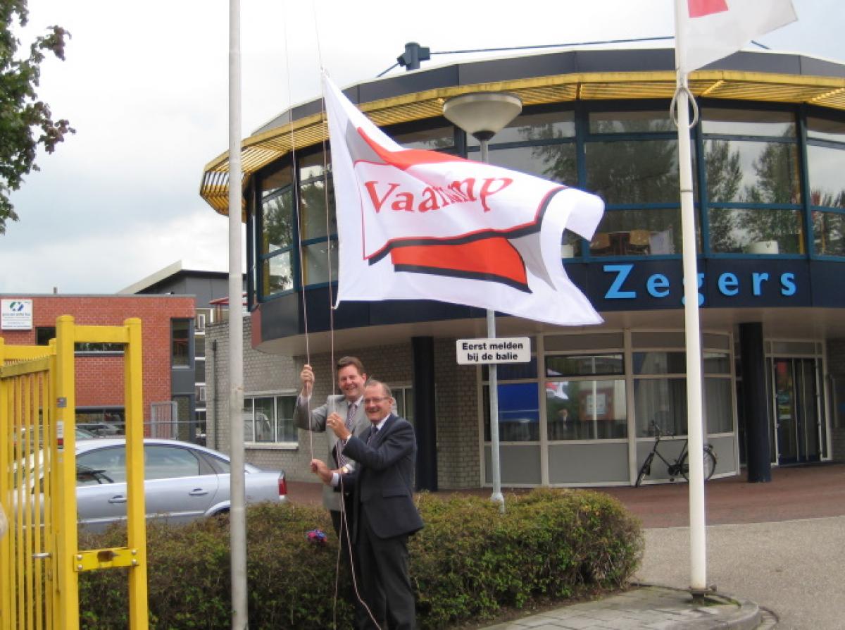 Vaarkamp koopt het voormalig gemeentewerf van de Gemeente Ede. Directeur Gert Jacobs hijst de vlag met wethouder - en oud-werknemer van Vaarkamp - Breunis van de Weerd.