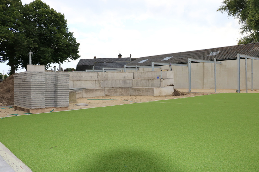 Er is veel werk verzet door vrijwilligers om de kosten te drukken. Ook is er veel hergebruikt zoals de hoefijzervormige tribune en voor een deel ook de tegels. Als laatste is de beplanting ingeplant met vrijwilligers.
