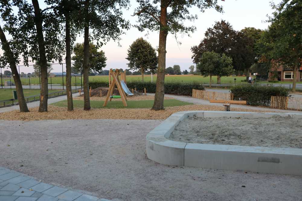 Beukenhagen begrenzen het schoolterrein en er zijn kunstgras en houtsnippers aangebracht rond de speelobjecten. Door het plaatsen van keerwanden werd het hoogteverschil opgevangen.